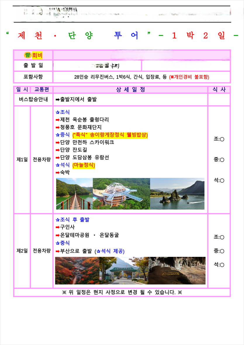 제천·단양 투어 1박2일 페이지 정보 목록 제천·단양 투어 1박2일 여행지 제천·단양 투어 1박2일 상품가 [리무진] 31만원 출발일 매주 화,목,토 출발 포함사항 왕복리무진버스, 식사(1박6식), 관광지 입장료, 간식 불포함 개인경비, 국내여행자보험 특전사항 - 인쇄 여행상품소개 본문 이전글 설악산+백담사 1박2일 25.09.29 다음글 철원 잔도길 + DMG 생태공원 25.03.05 목록