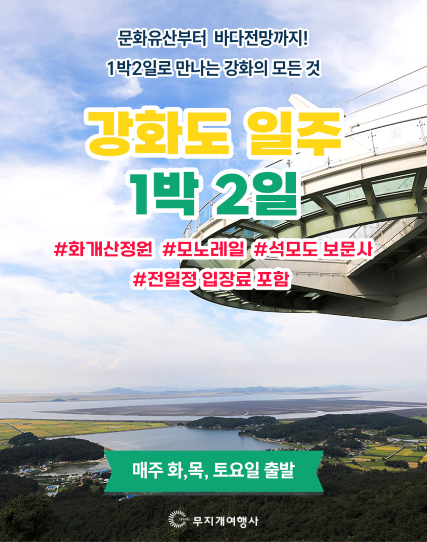 강화도일주+화개정원 1박2일 페이지 정보 목록 강화도일주+화개정원 1박2일 여행지 강화도일주+화개정원 1박2일 상품가 [44인승]270,000원 [리무진]310,000원 출발일 매주 화,목,토요일 출발 포함사항 전용버스, 숙박(4인실), 입장료, 1박6식, 간식 불포함 개인여행자보험 특전사항 인쇄 여행상품소개 본문 이전글 원주 그랜드밸리+가평 1박2일 25.09.26 다음글 서해 별미 여행 1박2일 25.03.05 목록