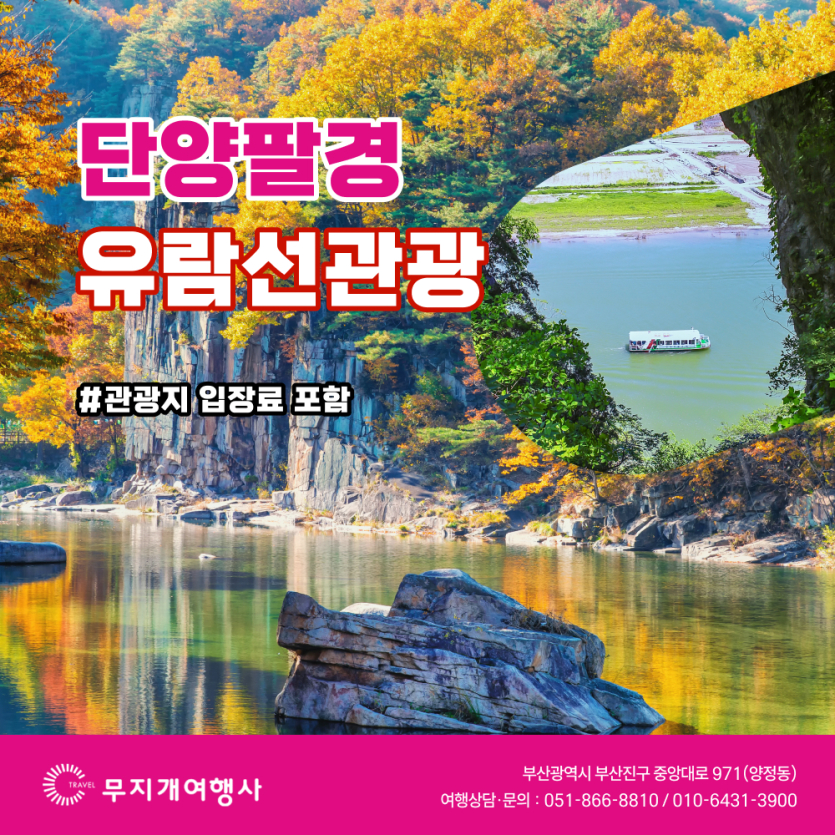 단양팔경 유람선관광 페이지 정보 목록 단양팔경 유람선관광 여행지 단양팔경 유람선관광 상품가 100,000원 출발일 수시출발(문의) 포함사항 왕복차량, 식사, 관광지입장료, 간식, 유람선비 불포함 국내여행자보험, 개인경비 특전사항 유람선비 포함 인쇄 여행상품소개 본문 이전글 내장산 단풍+내장사 25.10.01 다음글 여수 호화크루즈+오동도 25.03.05 목록
