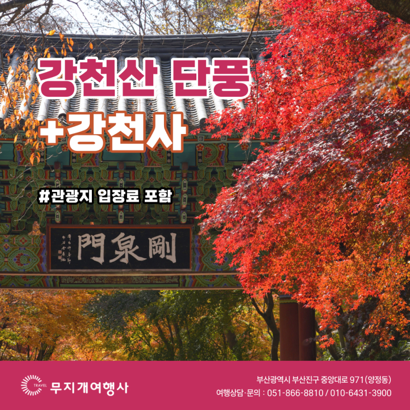 강천산 단풍+강천사 페이지 정보 목록 강천산 단풍+강천사 여행지 강천산 단풍+강천사 상품가 90,000원 출발일 수시출발(문의) 포함사항 왕복차량, 식사, 관광지입장료, 간식 불포함 국내여행자보험, 개인경비 특전사항 - 인쇄 여행상품소개 본문 이전글 주왕산 단풍+주산지 25.10.01 다음글 내장산 단풍+내장사 25.10.01 목록